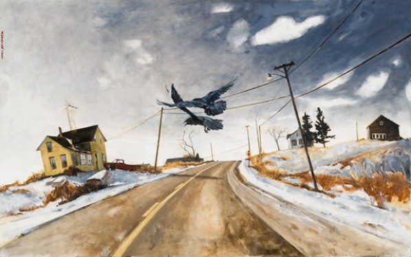 Very evocative of impending disaster, these brilliantly conceived and composed scenes are sinister by implication only. She allows the mind to fill in what she only hints at. Crows, roads, utility wires somehow are imbued with religious content.