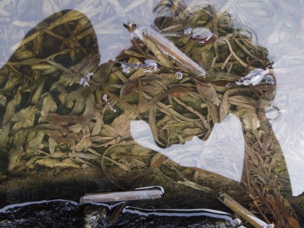 Mysterious photographs of nudes reflected in water. These un-photshoped images capture the life and colors in Maine tidepools, as well as the reflection of the nudes standing above. These are natural double exposures with exquisite shadows and complexities of scale.