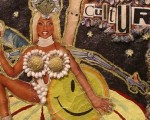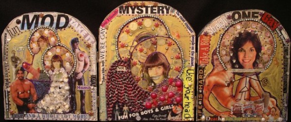 Popular culture icons in a temple environment made of kitsch and sparkles. Elvis, Madonna, and Michael Jackson are adorned and set in an alter like a gilded Russian saint.