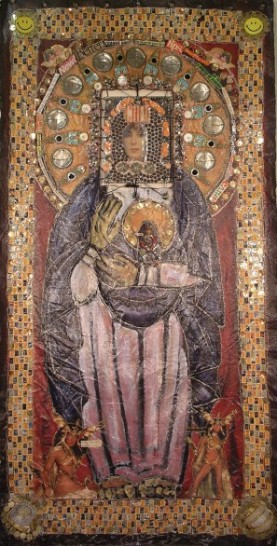 Popular culture icons in a temple environment made of kitsch and sparkles. Elvis, Madonna, and Michael Jackson are adorned and set in an alter like a gilded Russian saint.