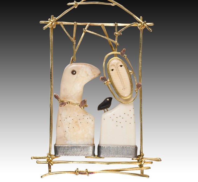 Brings the spirits of the ancient soul into wearable jewelry. She carves stone, ivory and wood into talismans and sets them with reed like bundles of gold wire. For 30 years, her work has developed along themes, which are keyed to visual metaphors, often found in older iconographies representing the powers of sun, moon, wind, rain, stones, plants and a selection of animal residents that determine the rural, non-industrial landscape. $500 to $5000.