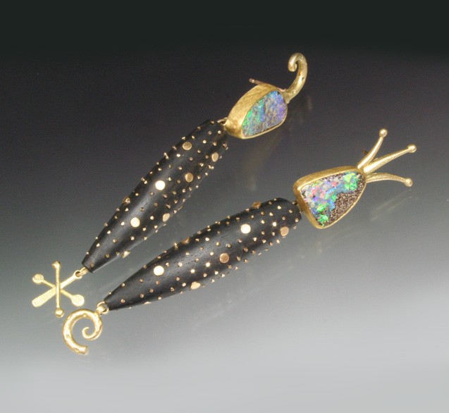 Black ebony, pearls with gold studs, and mystical shapes of the cosmos are the design vocabulary found in this light-weight and big look jewelry. She likes to carve the ebony into geometric forms reminiscent of crystals. $500 to $2000.
