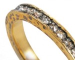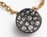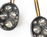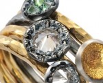Likes to set stones up side down so we can appreciate their underside. Gold and oxidized silver with small diamonds set in dapped discs give an incredibly large amount of sparkly life to rings and earrings. $350 to $1500.